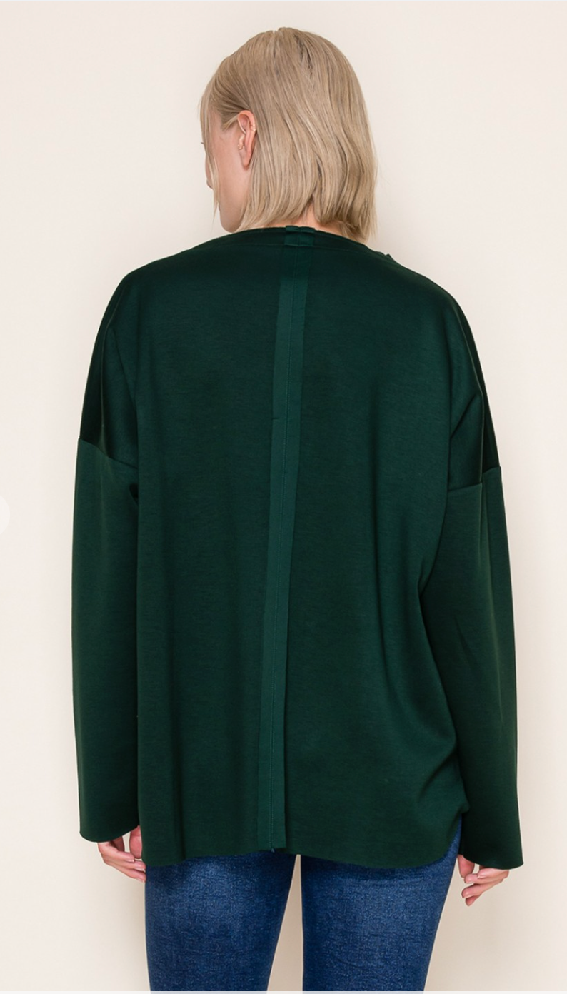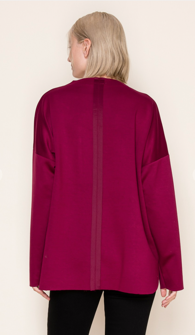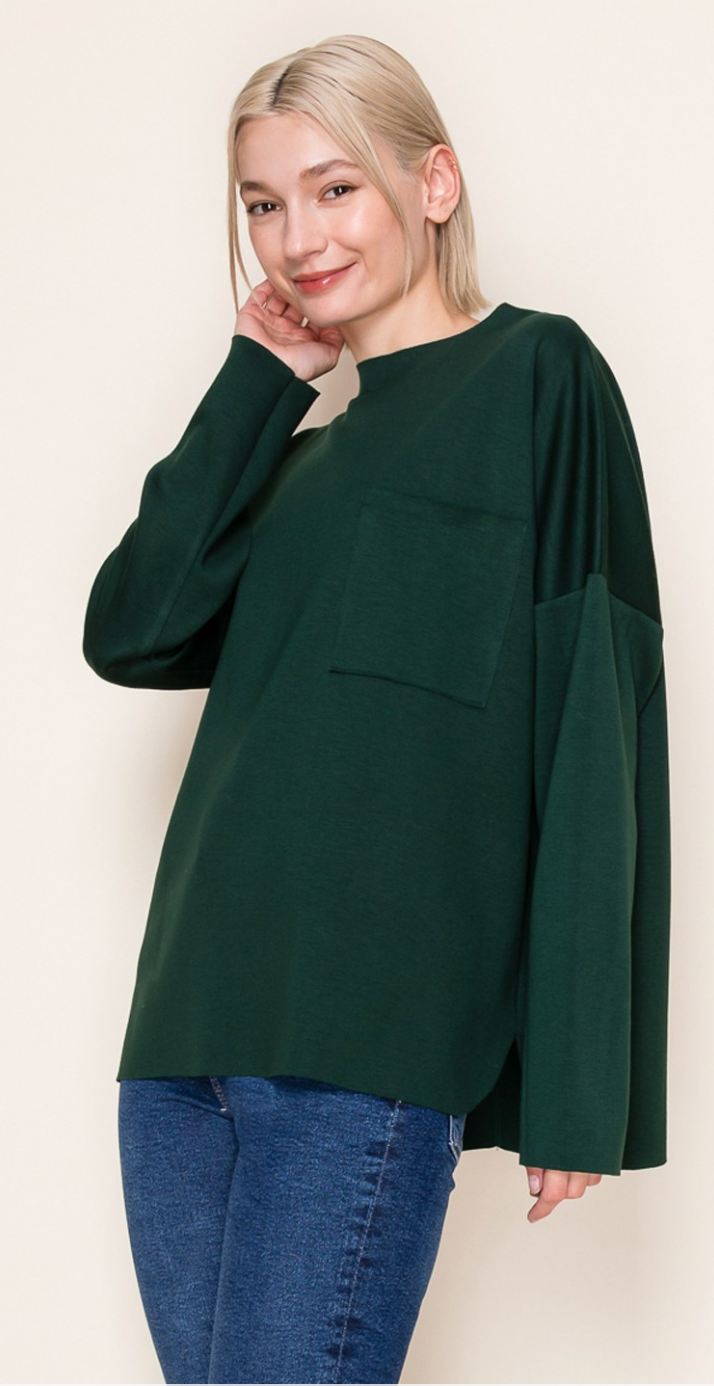 A long sleeve solid knit top with a round neck featuring a patch pocket and a loose fit. Fabric is a lightweight knit.