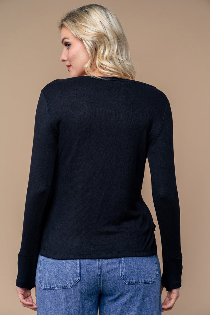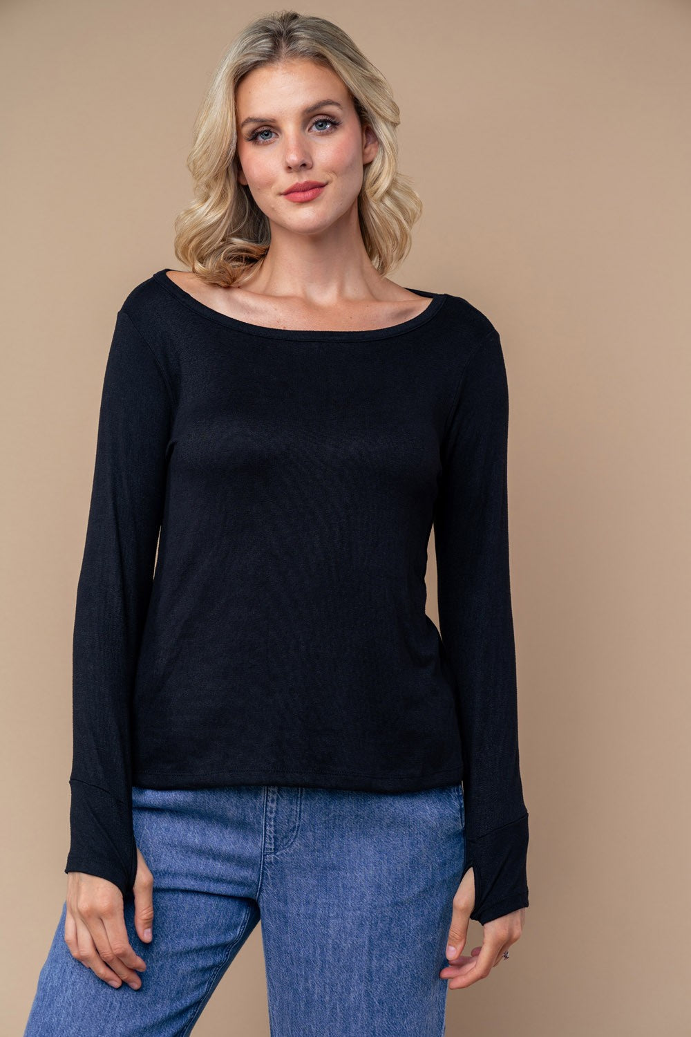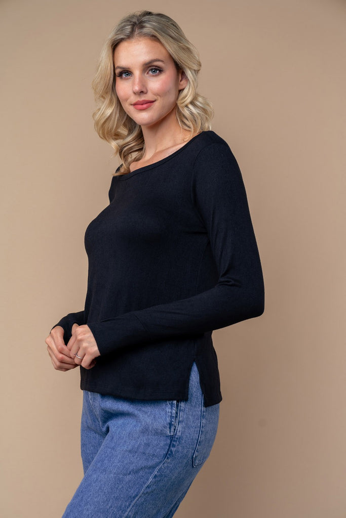 Boat Neck Hi-Lo Top with Side Slits and Thumb Holes - Black