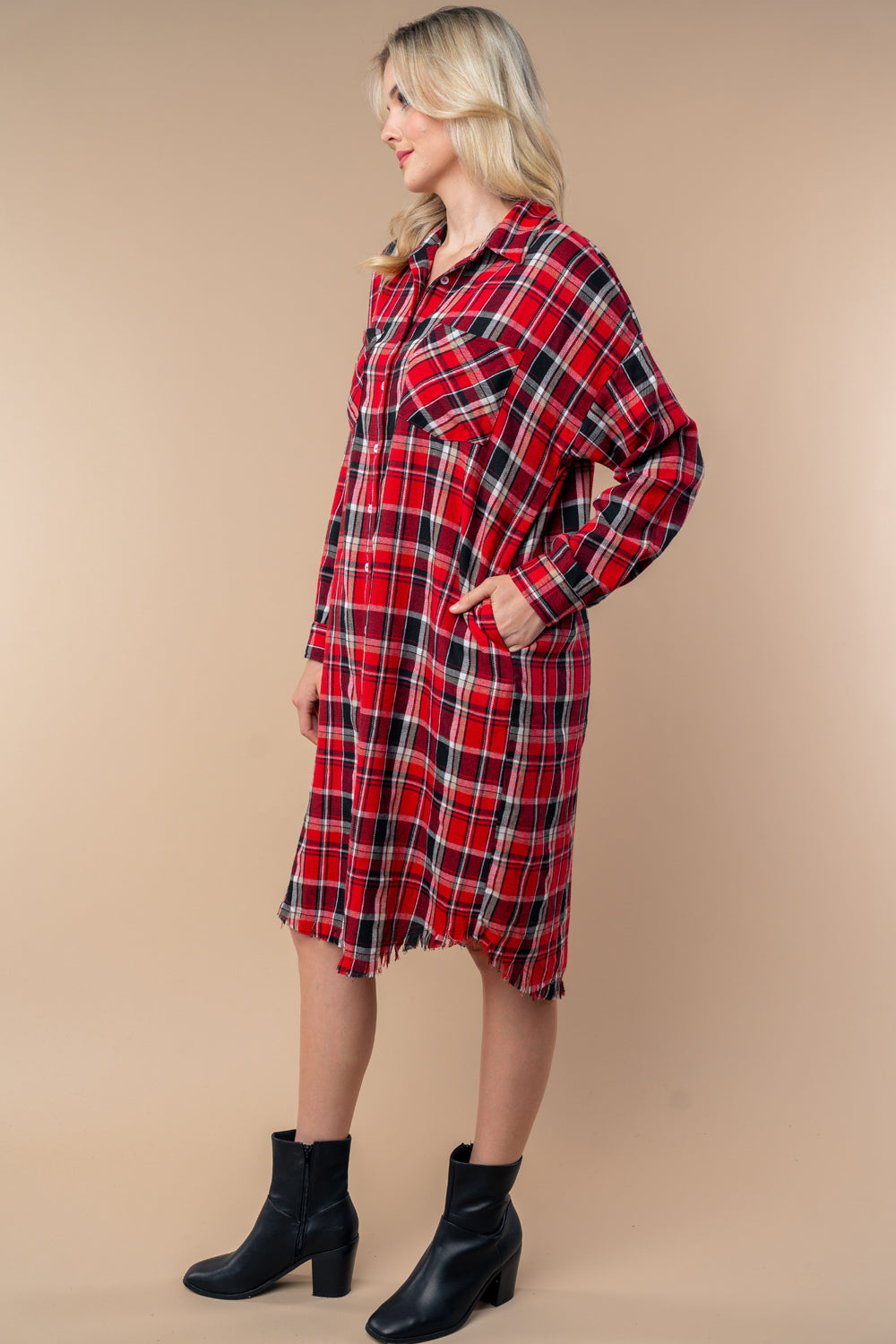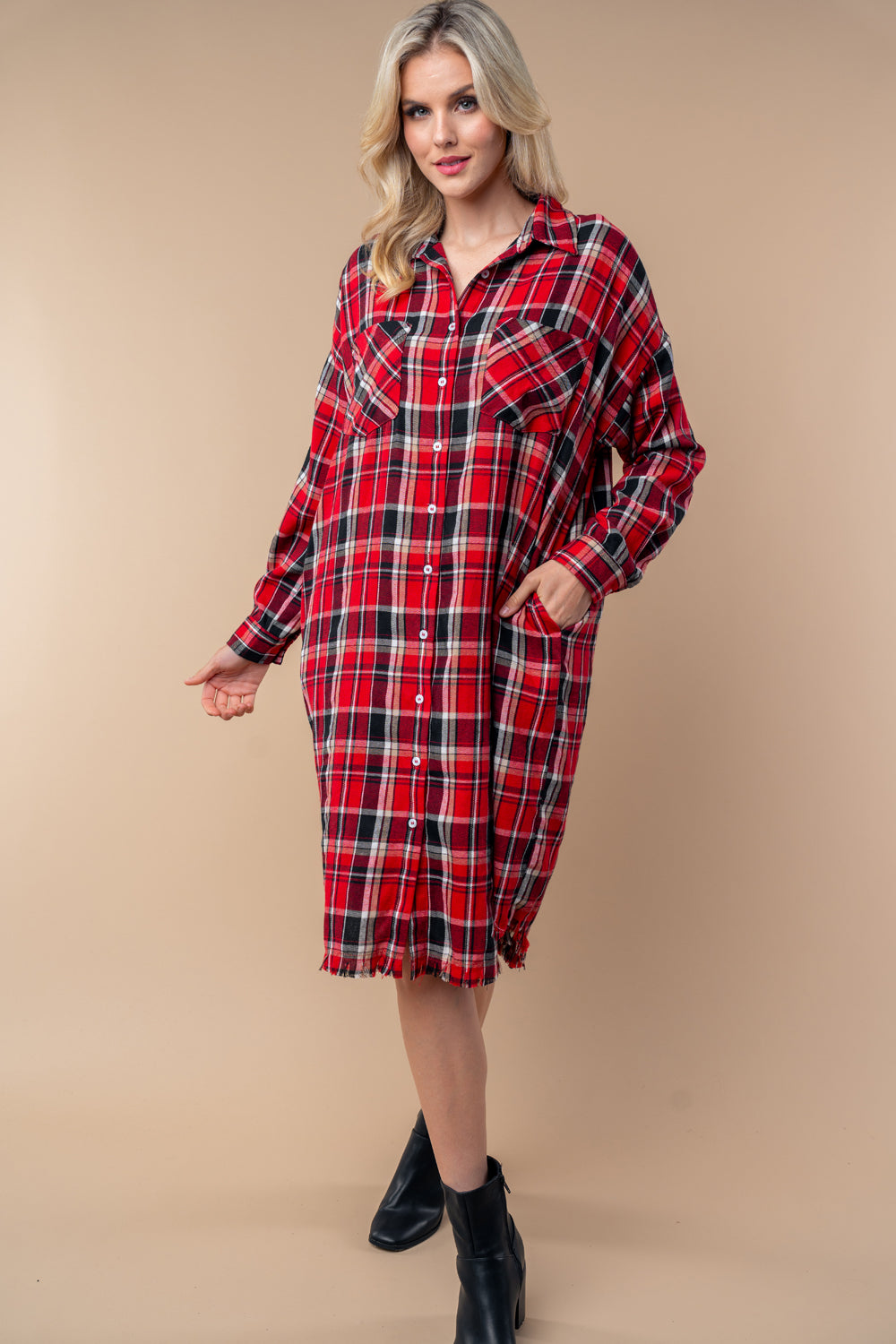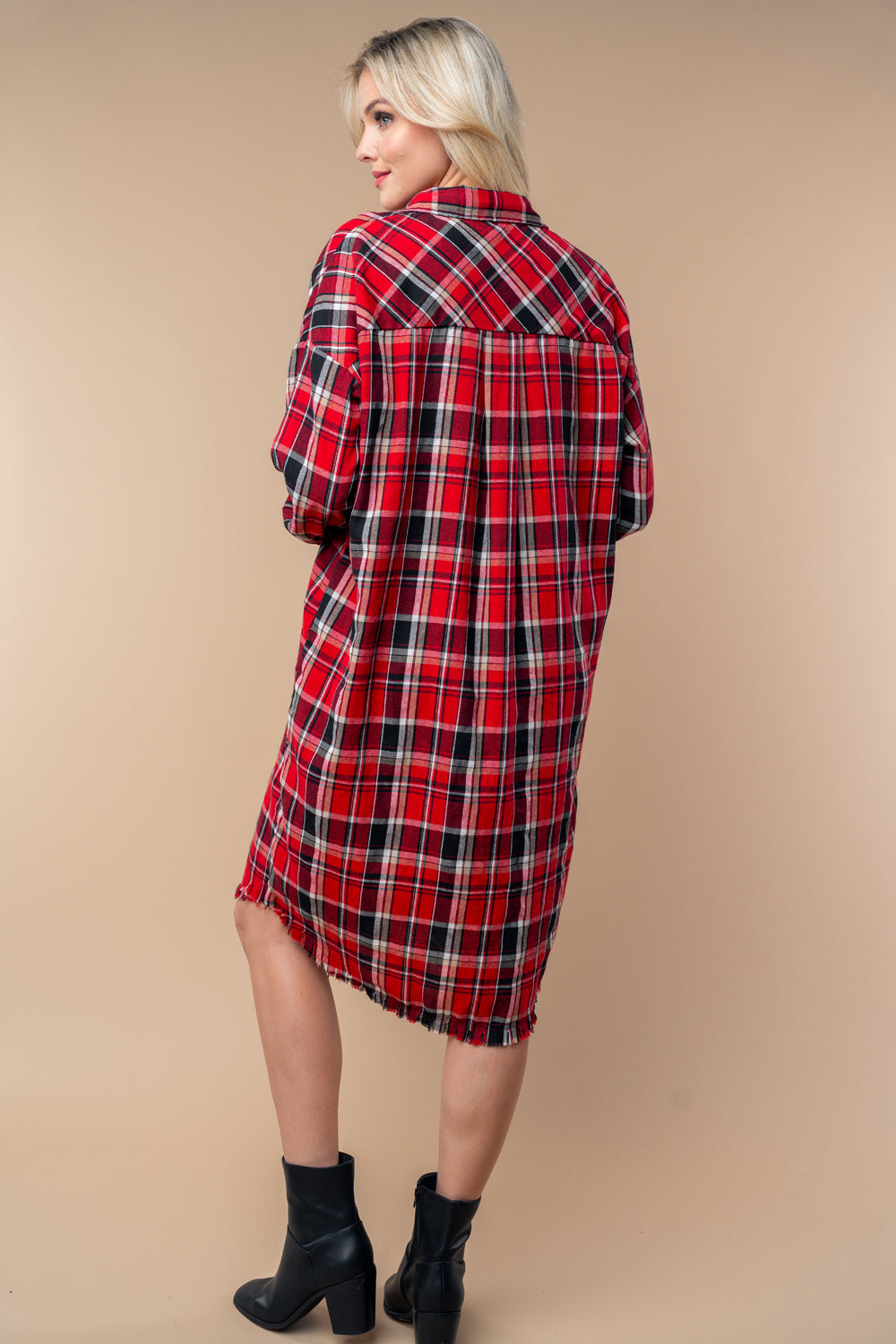 A long sleeve plaid woven shacket with a button down front featuring a side pockets, a patch pocket, and a midi length.