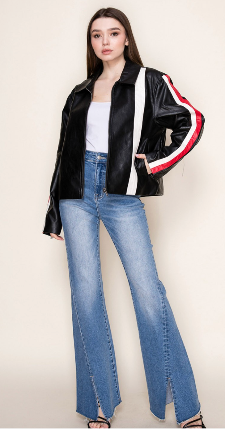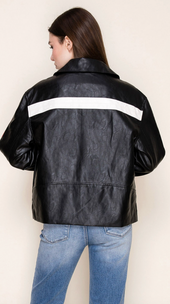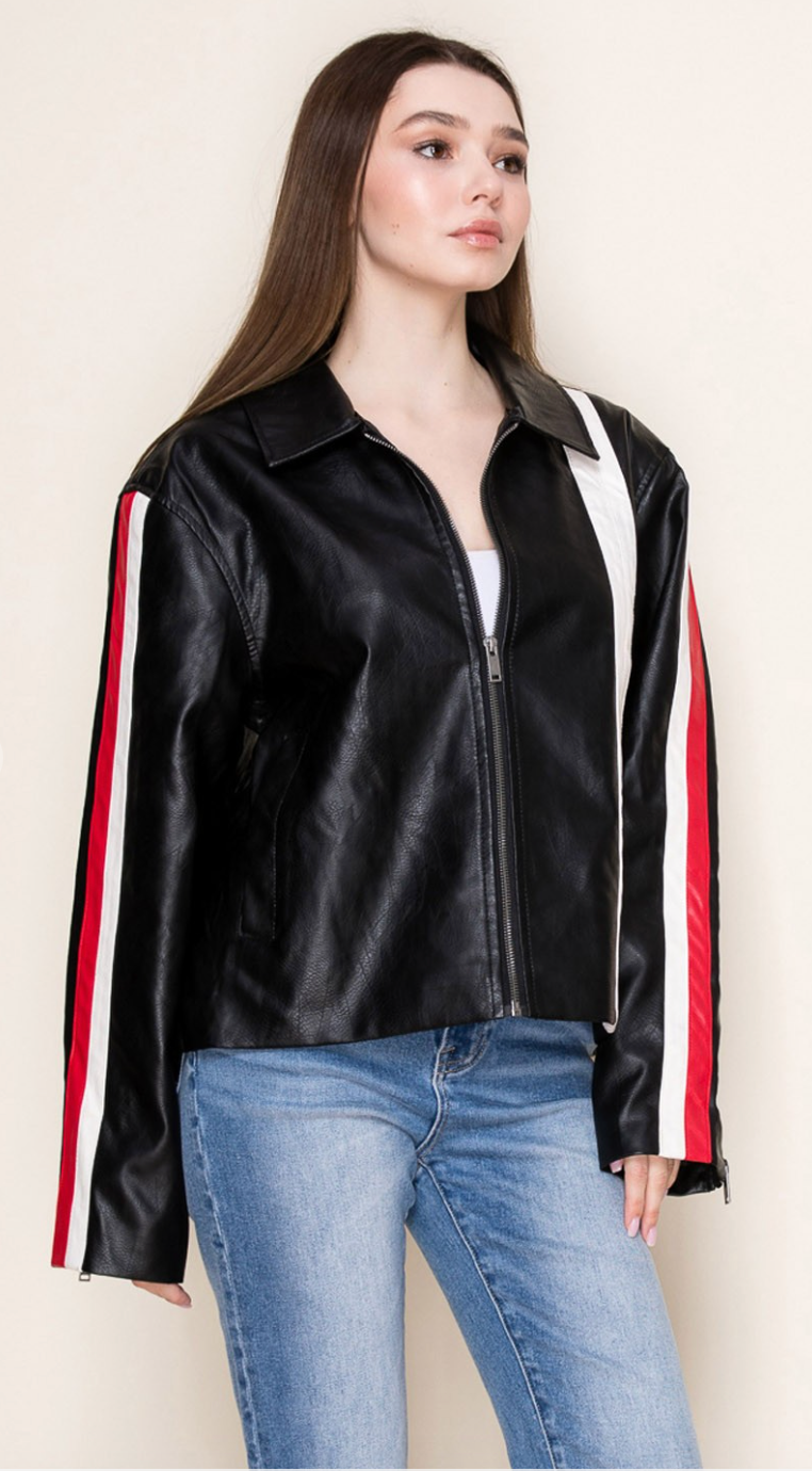 A long sleeve solid leather jacket with a collared zip-up front featuring striped sleeves and a color block stripe front and back. Fabric is a medium weight leather.