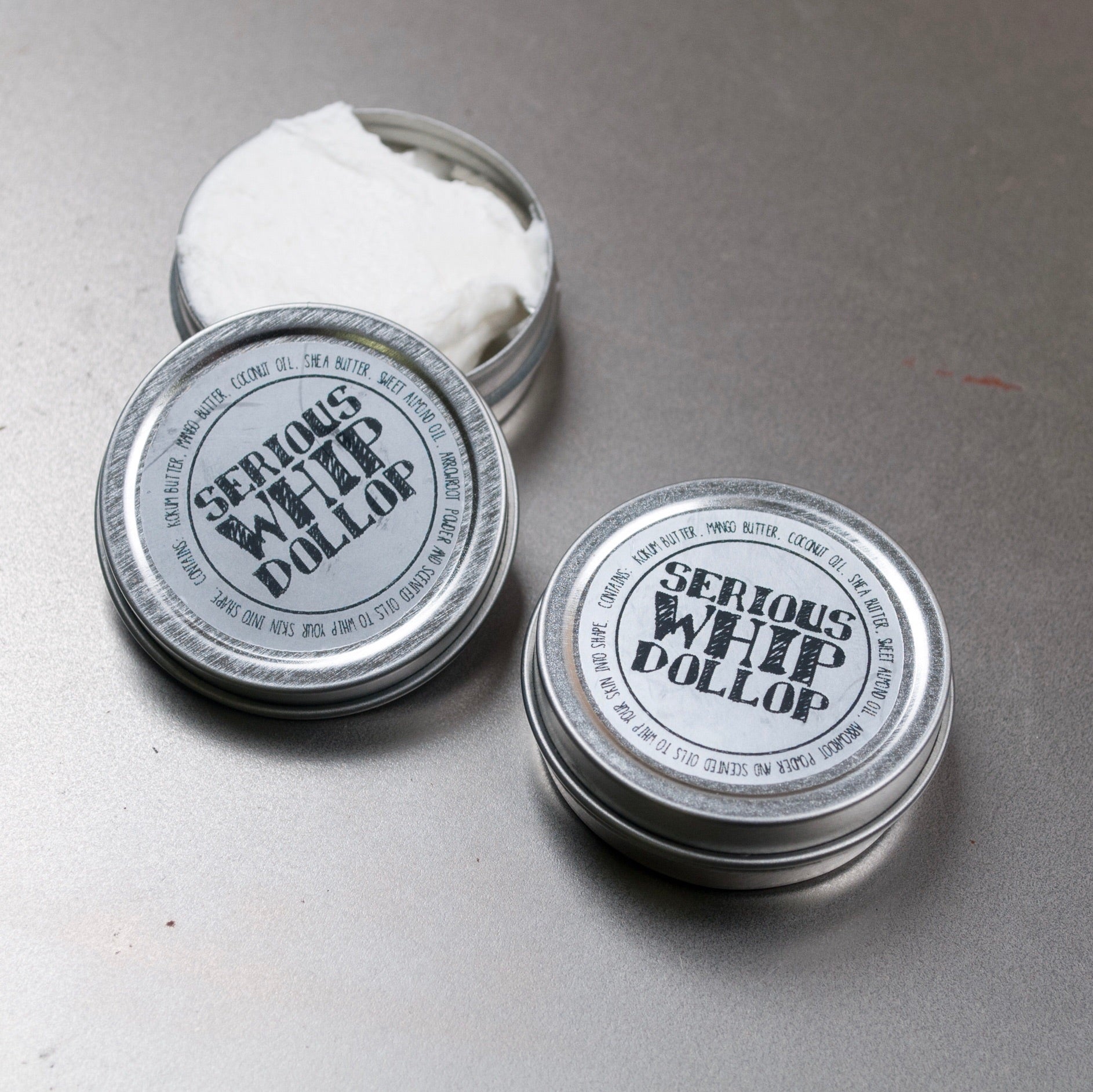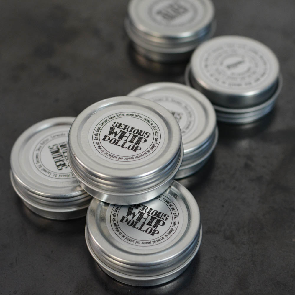Serious Whip Lotion is an all-natural lotion that will help combat even the driest and most chapped skin without leaving a greasy residue behind. Serious Whip has been whipped into a fluffy consistency and it has been piped into a wide-mouth metal tin that makes application easy and smooth. Whip is lightly scented... not too sweet and not too strong.