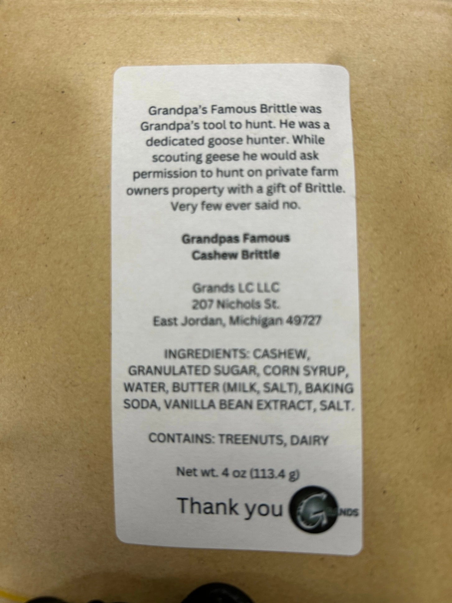 Grandpa’s Famous Brittle was Grandpa’s tool to hunt. He was a dedicated goose hunter. While scouting geese he would ask permission to hunt on private farm owners' property with a gift of Brittle. Very few ever said no.