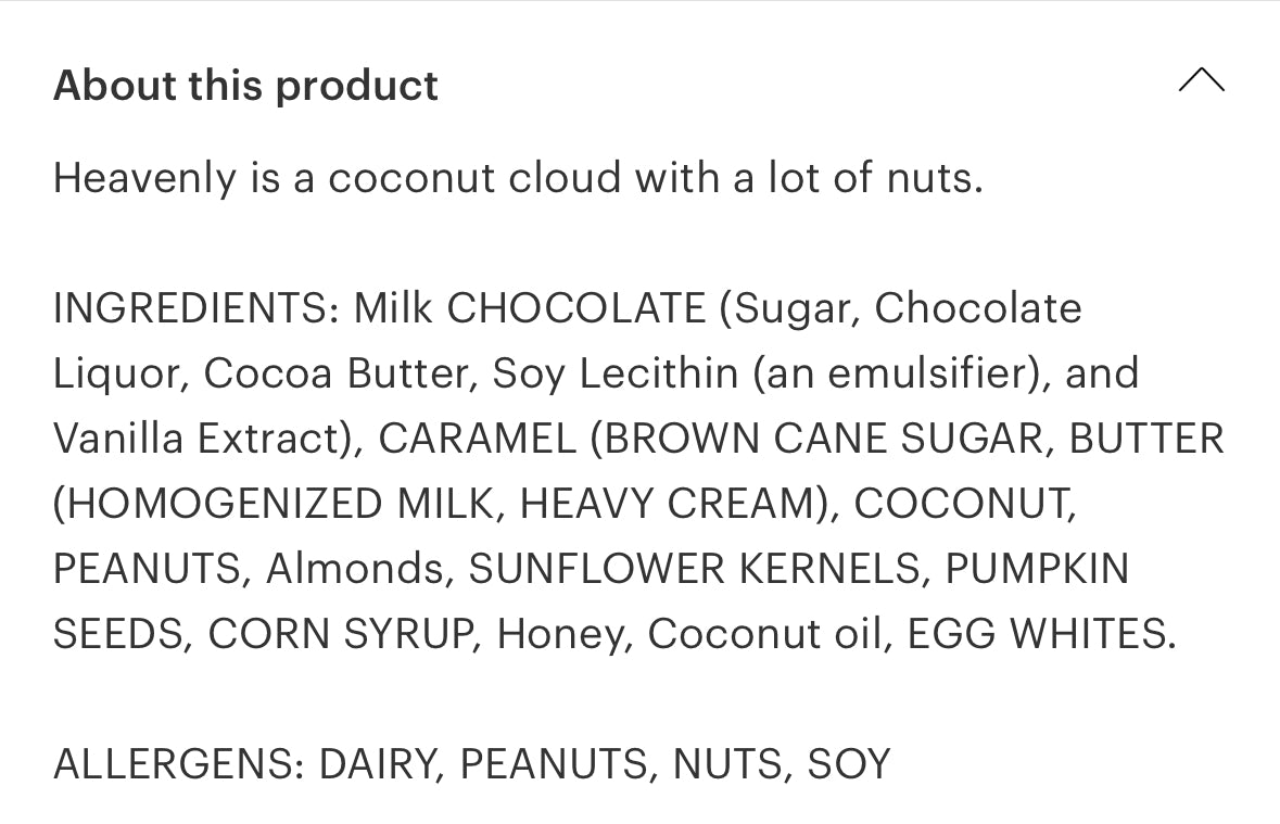 INGREDIENTS: CASHEW, GRANULATED SUGAR, CORN SYRUP, WATER, BUTTER (MILK, SALT), BAKING SODA, VANILLA BEAN EXTRACT, SALT.