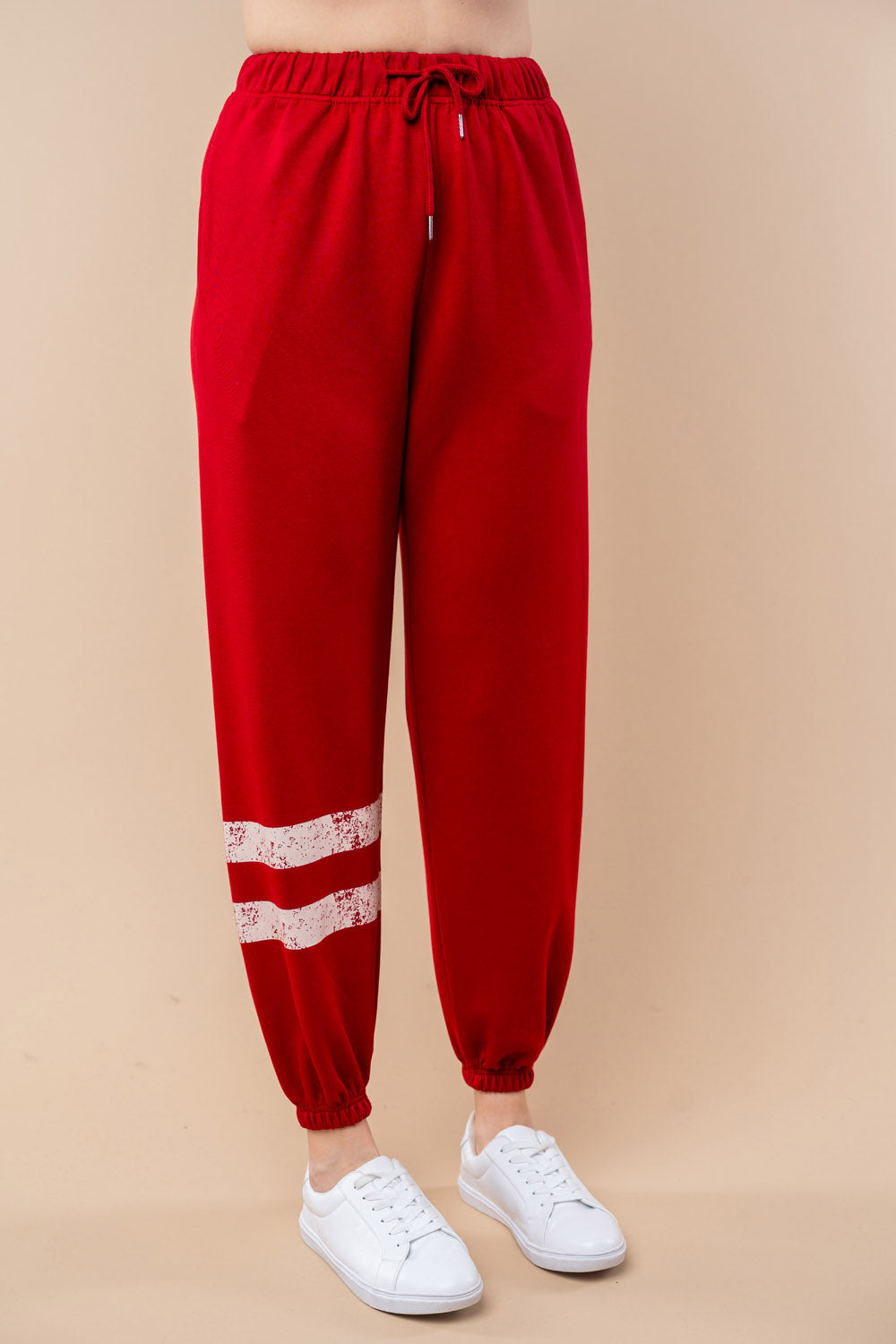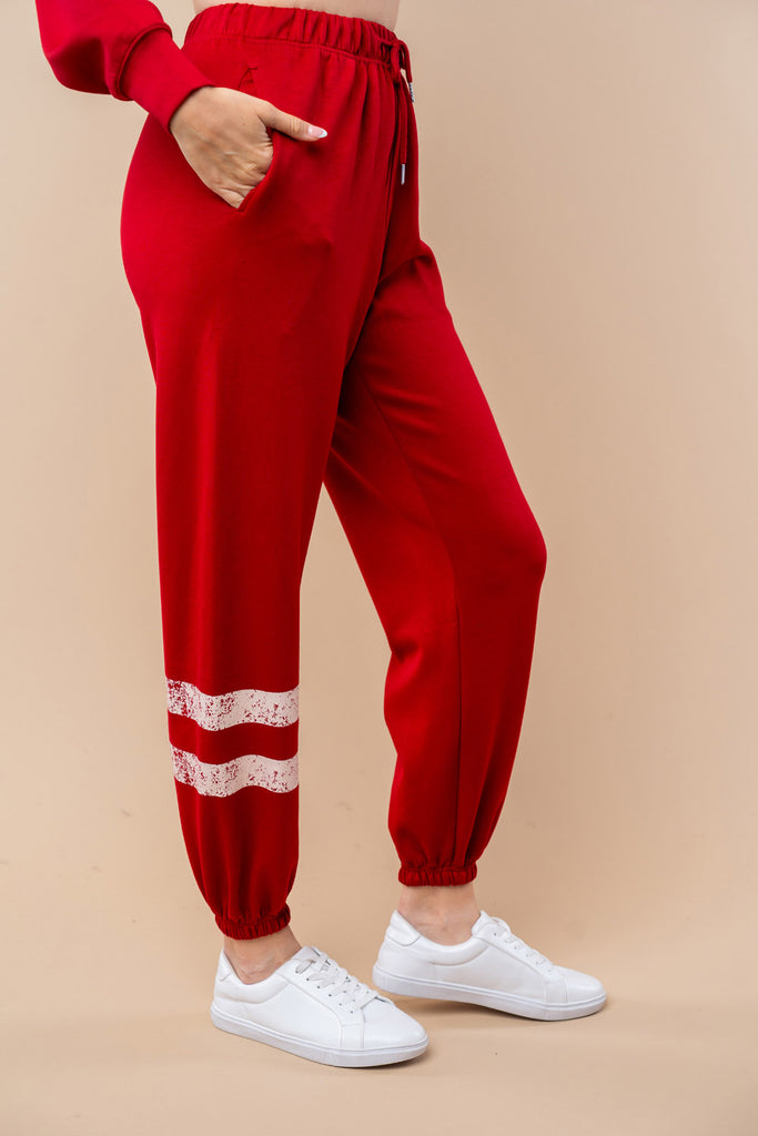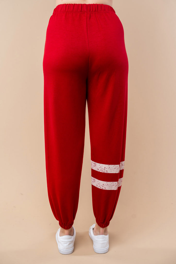 High Waisted Solid Knit Jogger with Striped Leg - Dark Red - Full
