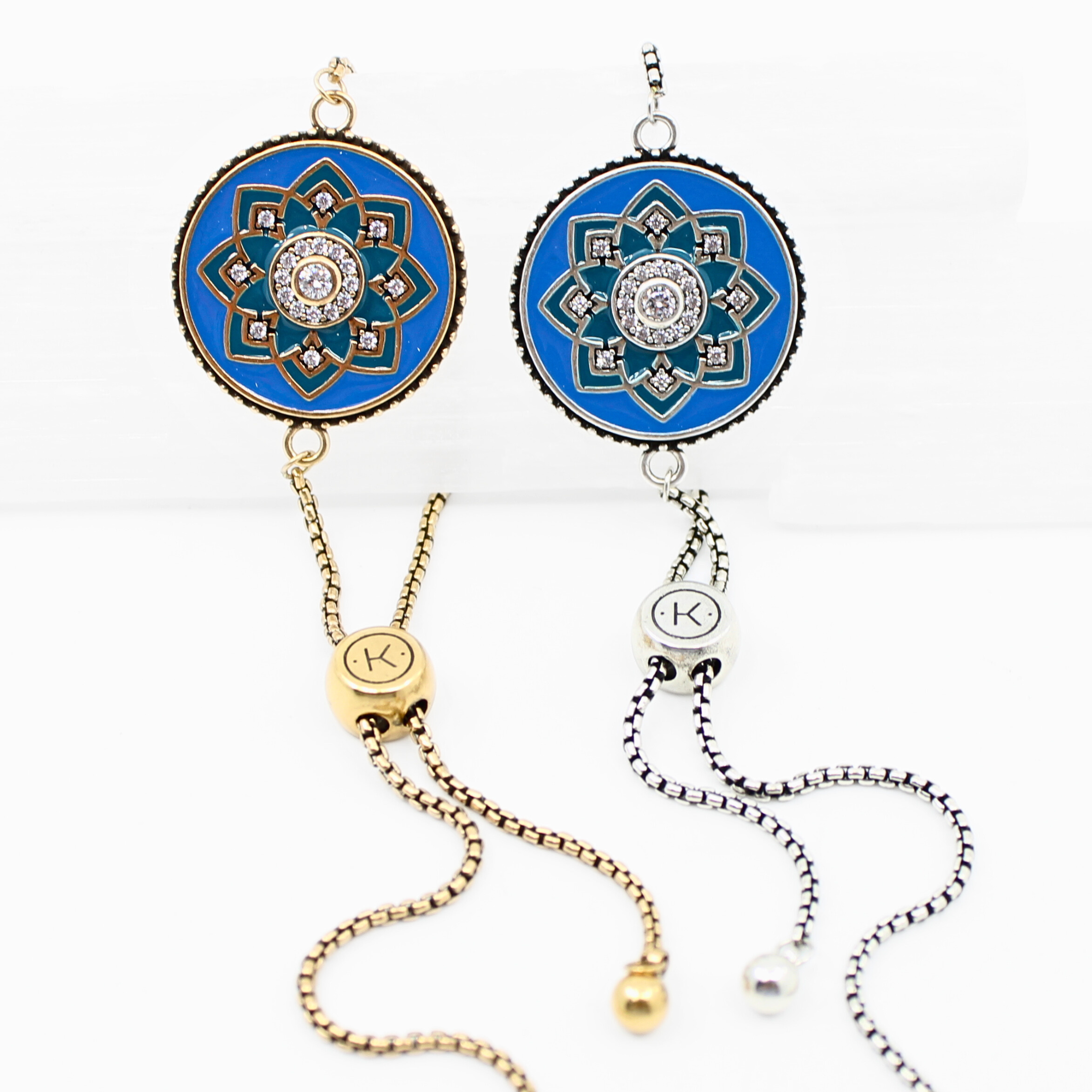Product Details: Adjustable chain bracelet featuring circular pendant with mandala design, blue enameling and crystal inlay; message inscribed on reverse.Â
