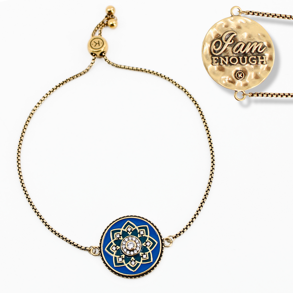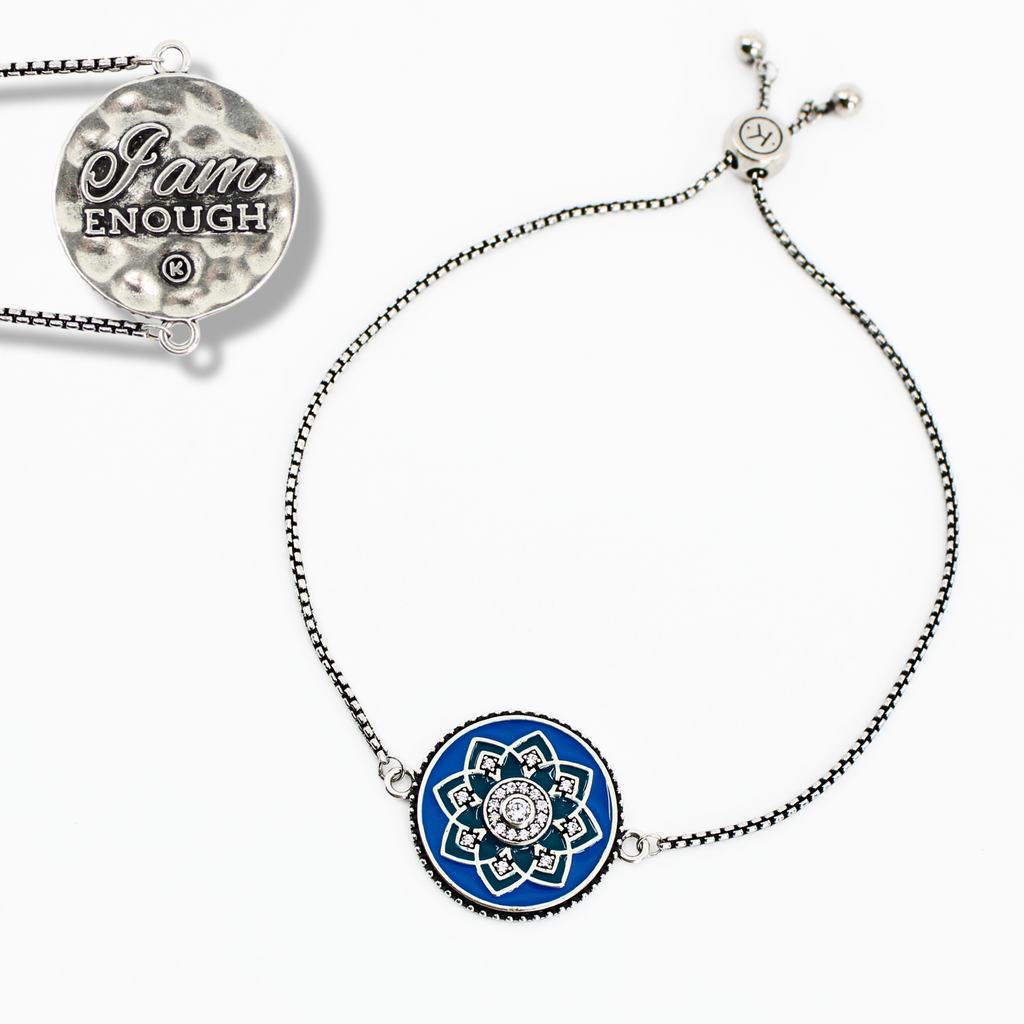 A little sparkle, a little soul. This adjustable chain bracelet features a round mandala pendant with radiant blue enameling and crystal inlay — a reminder to carry calm and confidence on your wrist. On the back, the empowering message “I Am Enough” is inscribed, so you’ll never forget your worth.