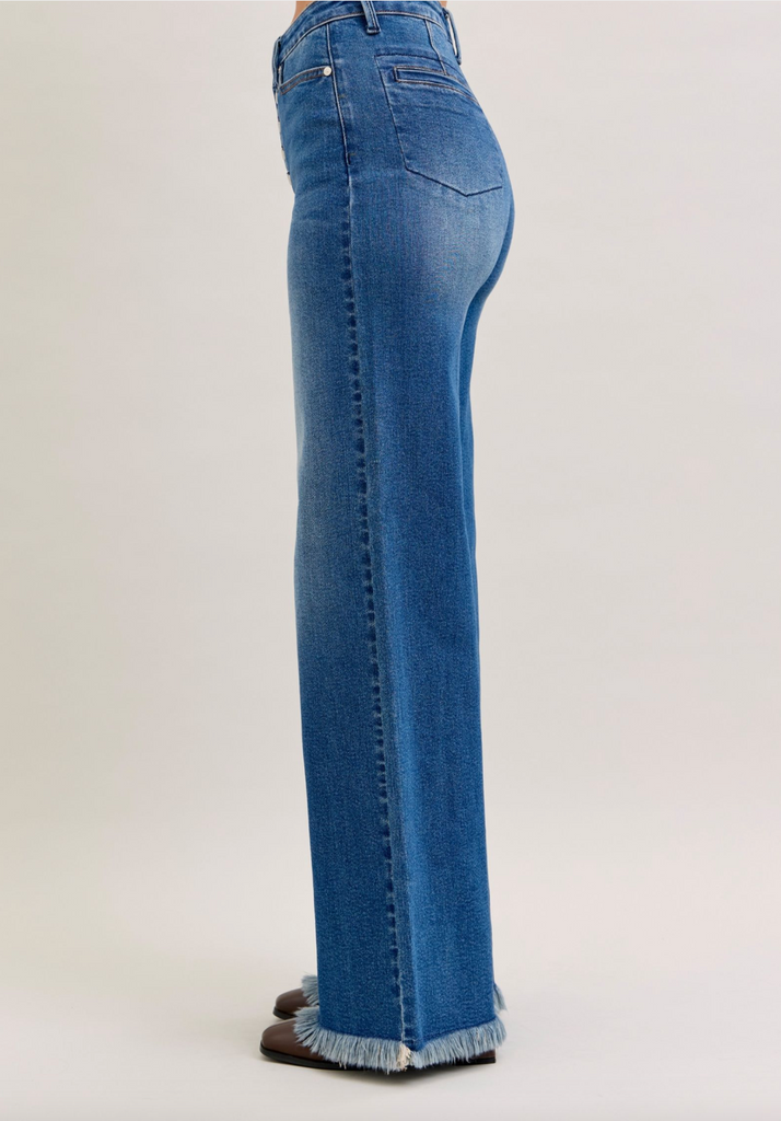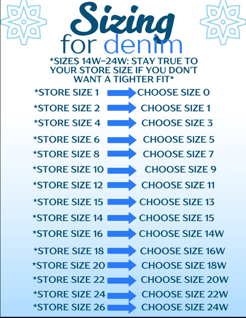 For example: if you are a size 8 in department stores, you will be a size 7 in Judy Blue. If you straddle between size 10 and 12, you will be an 11 in Judy Blue