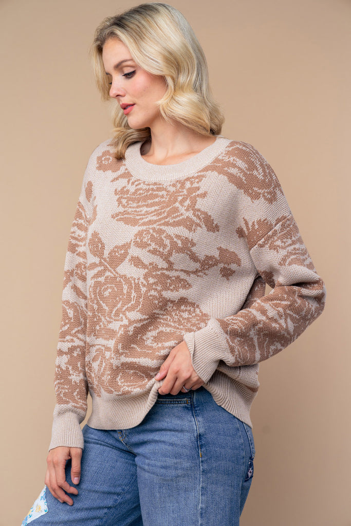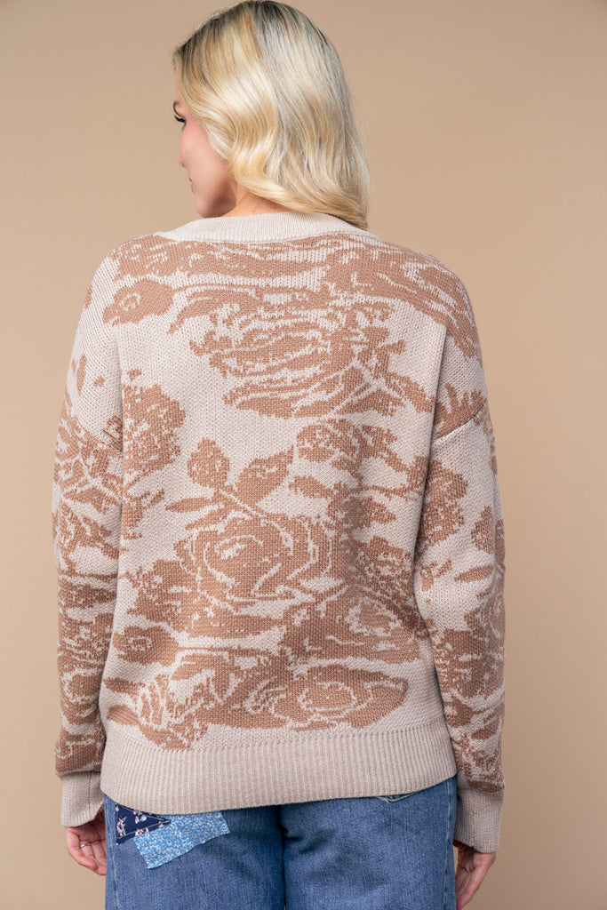 Long Sleeve Floral Print Knit Sweater - Taupe