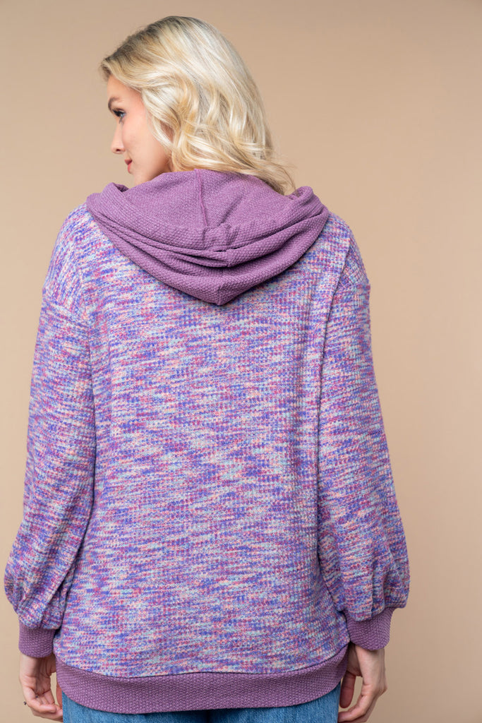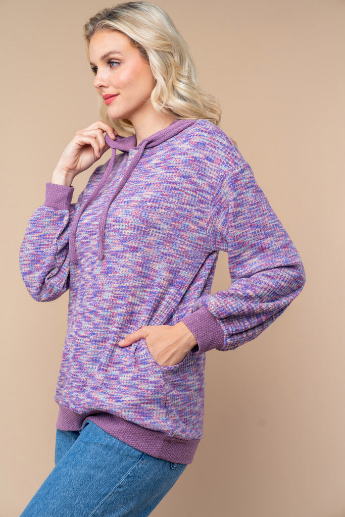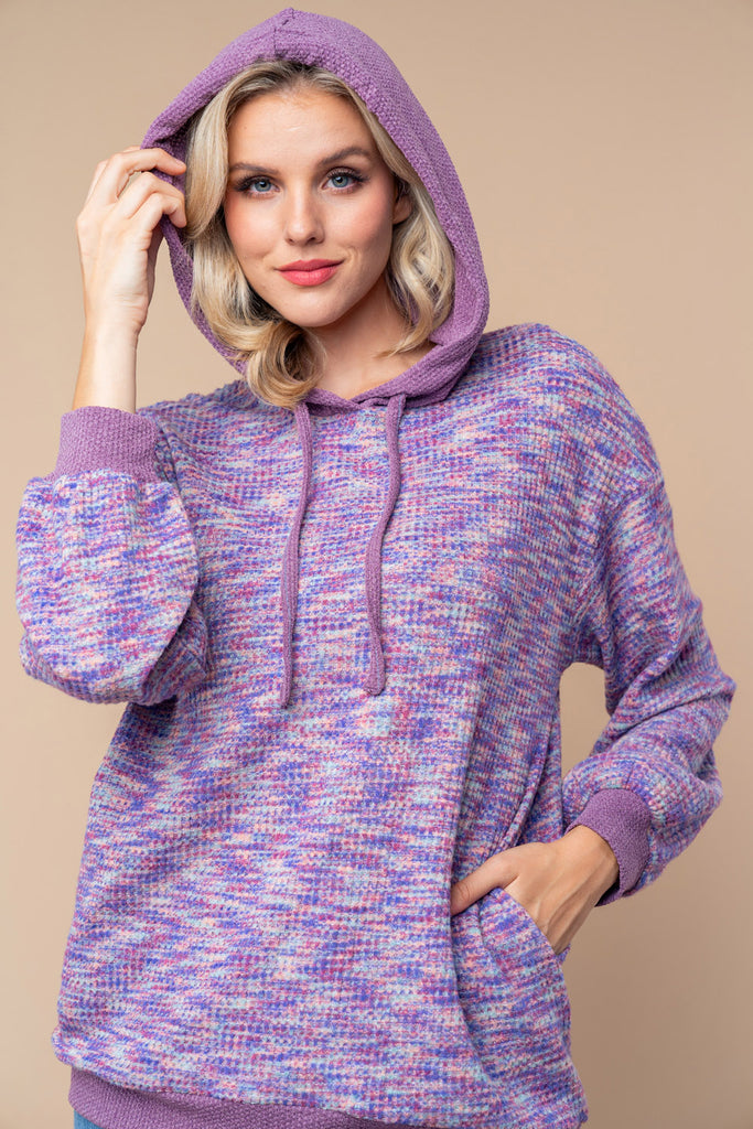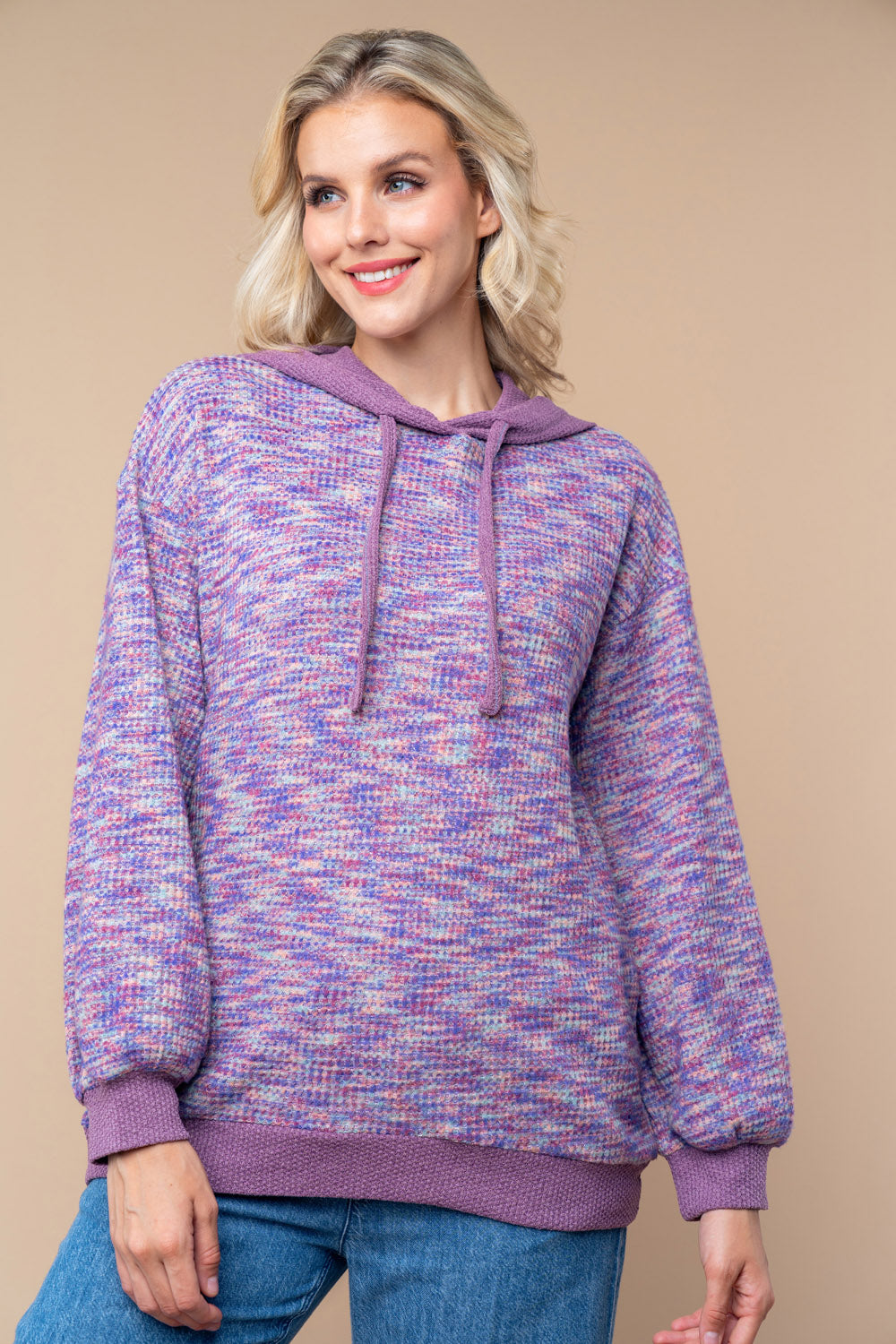 A long sleeve heathered solid knit top with a hood featuring adjustable drawstrings and side pockets.