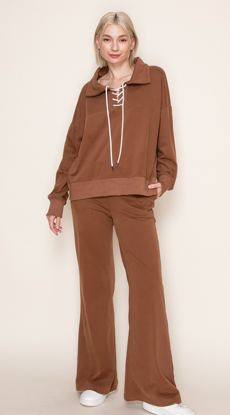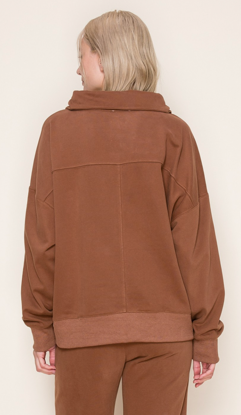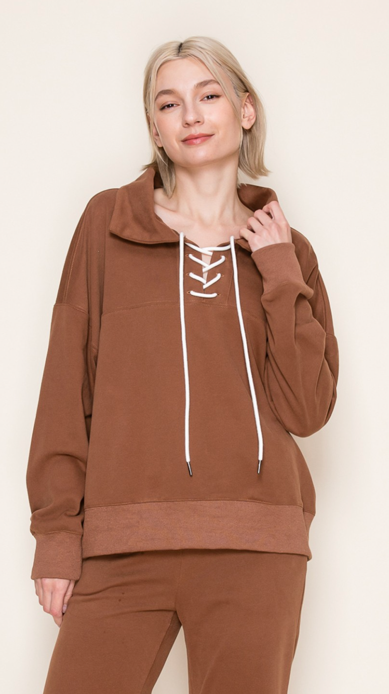 Long Sleeve Pull Over Top with Adjustable Drawstring Collar - Brown - Full