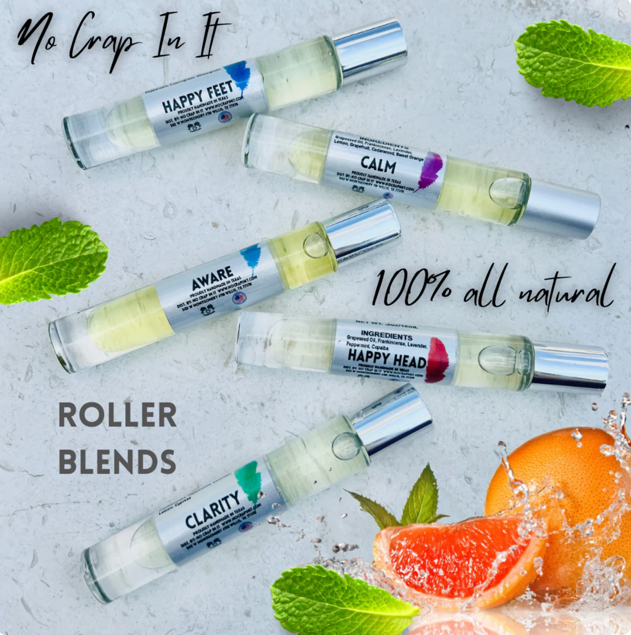 Like all of NO CRAP IN IT products these roller blends are HANDMADE in Texas, USA. They are 100% NATURAL!