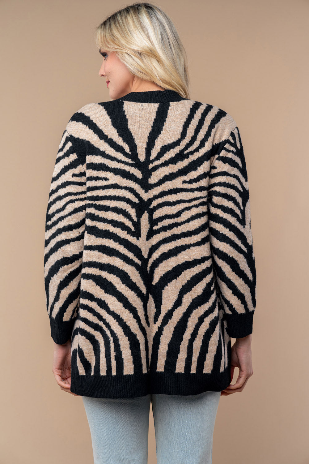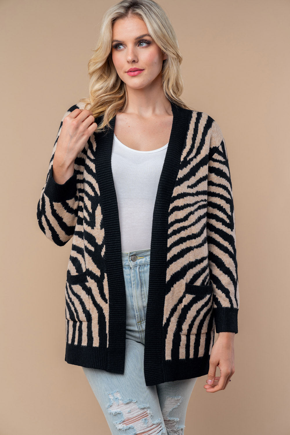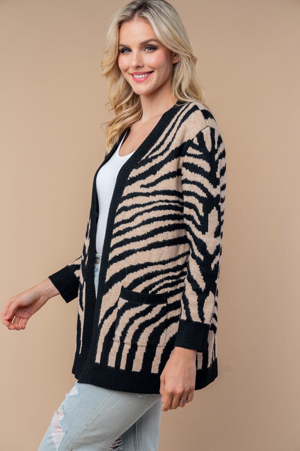 A long sleeve animal print knit cardigan with an open front featuring side pockets and a loose fit. Fabric is a lightweight knit.