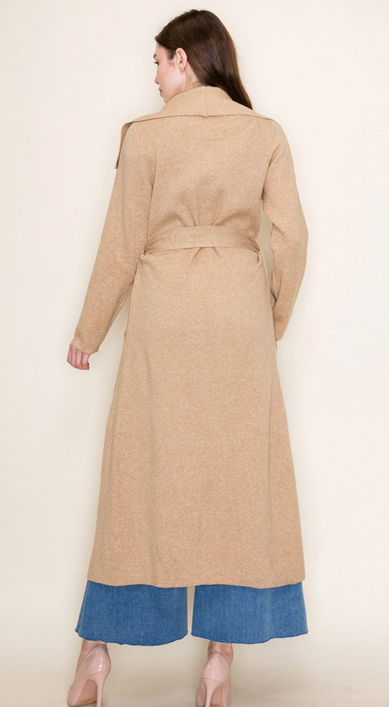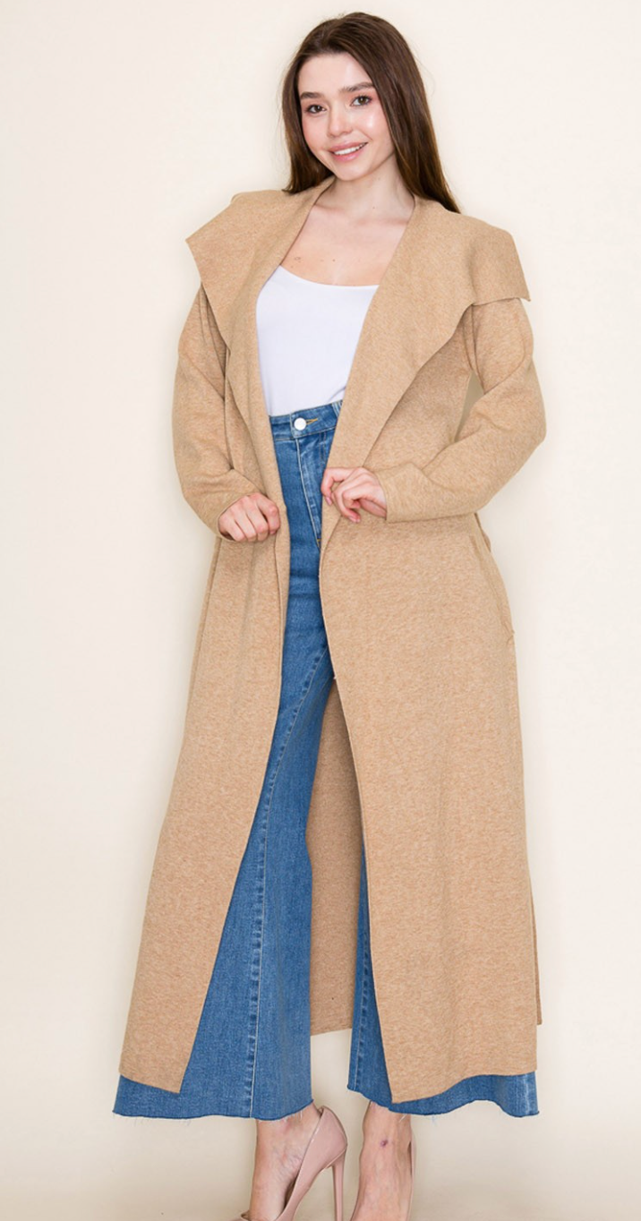 A long sleeve solid knit jacket with an open front featuring a belt tie and side pockets. Fabric is a lightweight knit.
