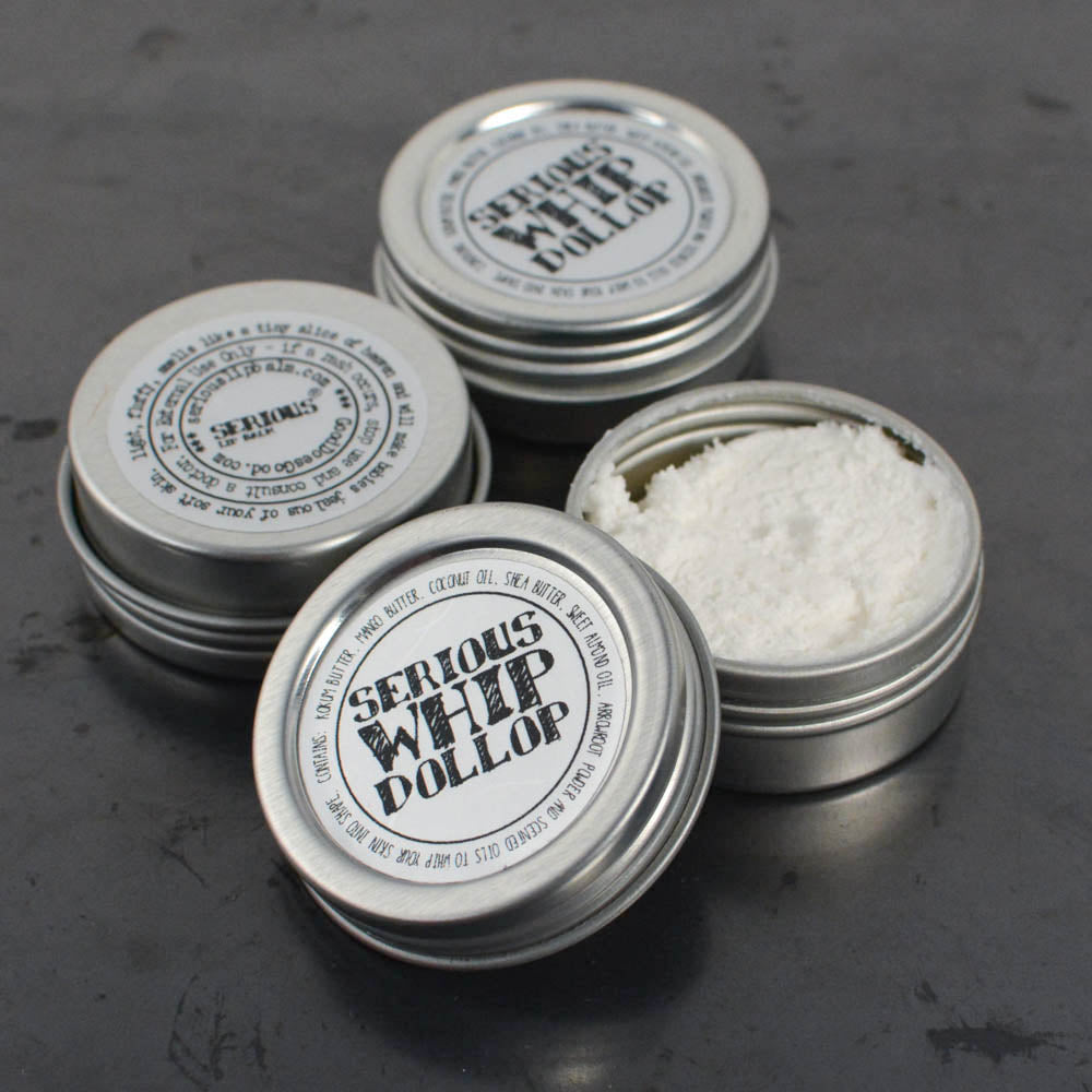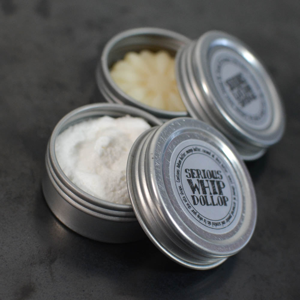 Serious Dollops are little tins of our Serious Whip, an all-natural lotion that will help combat even the driest and most chapped skin without leaving a greasy residue behind. Serious Whip has been whipped into a fluffy consistency and it has been piped into a wide-mouth metal tin that makes application easy and smooth. Whip is lightly scented... not too sweet and not too strong.