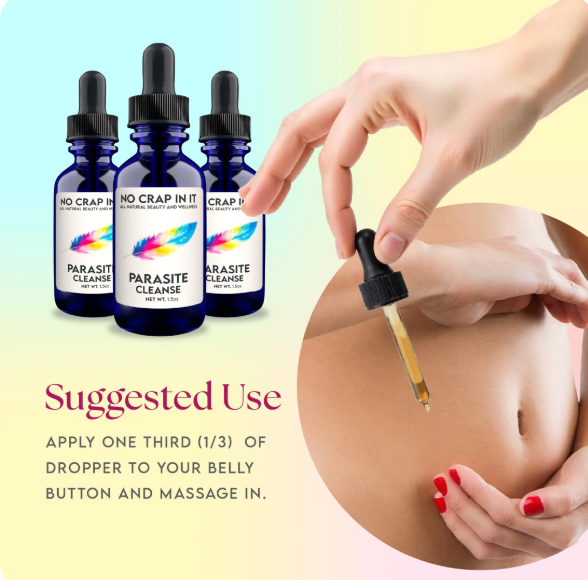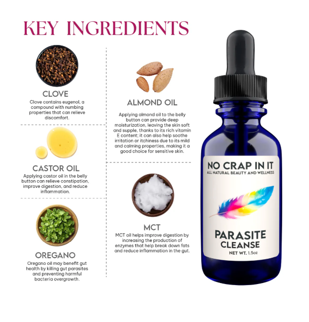 2. Parasite Cleanse Belly Oil: Apply 1/3 dropper into your belly button and massage onto your stomach in circular motions twice daily. Ideally in the morning and evening.