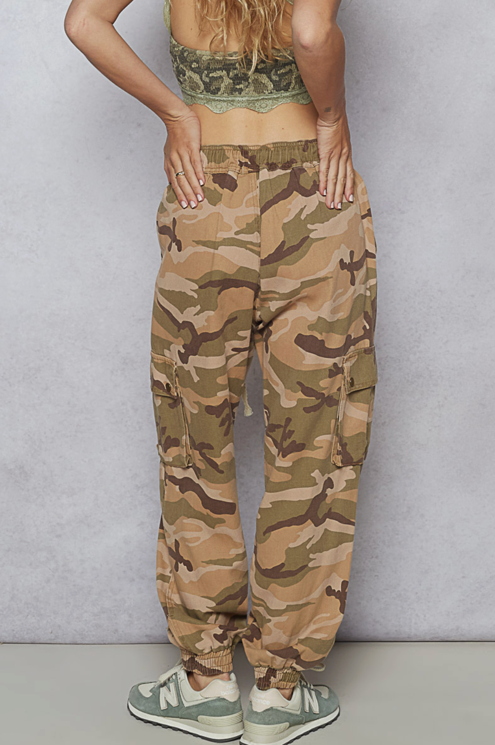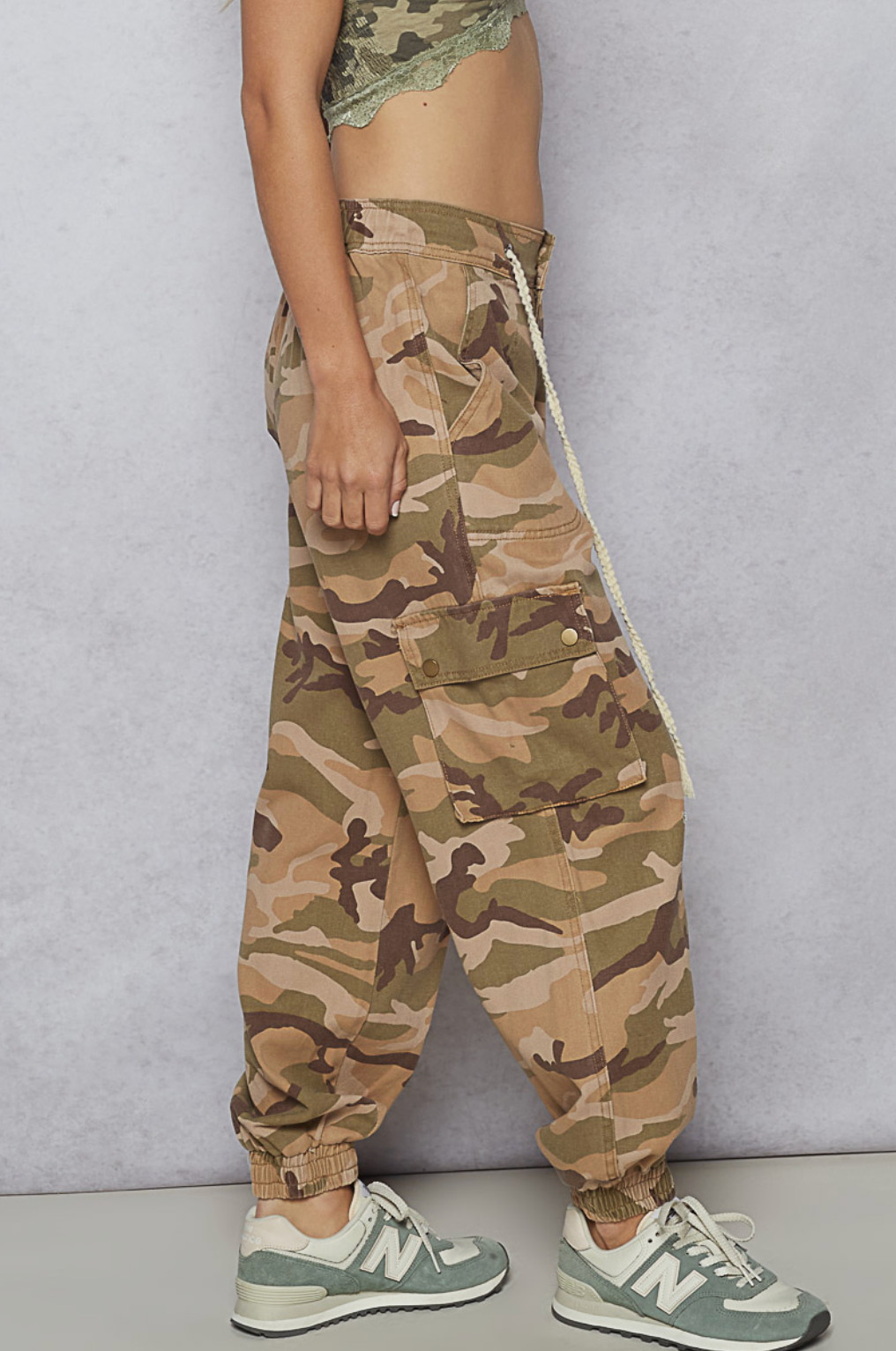 Designed in camo twill jogger pants, box pocket detailing, button & strap on waist.