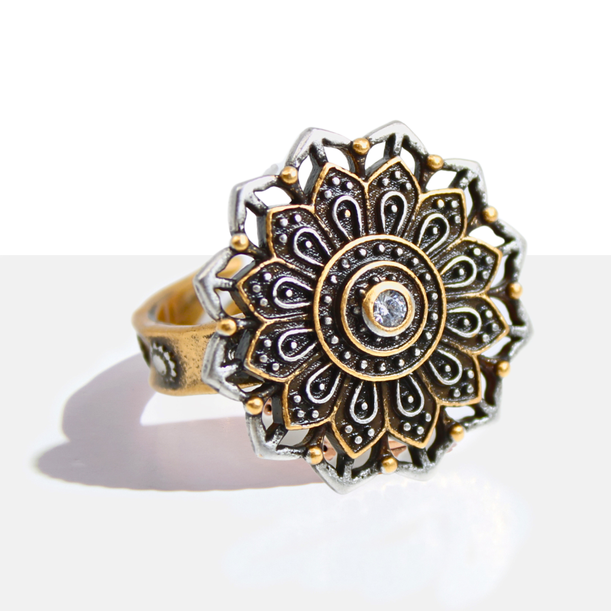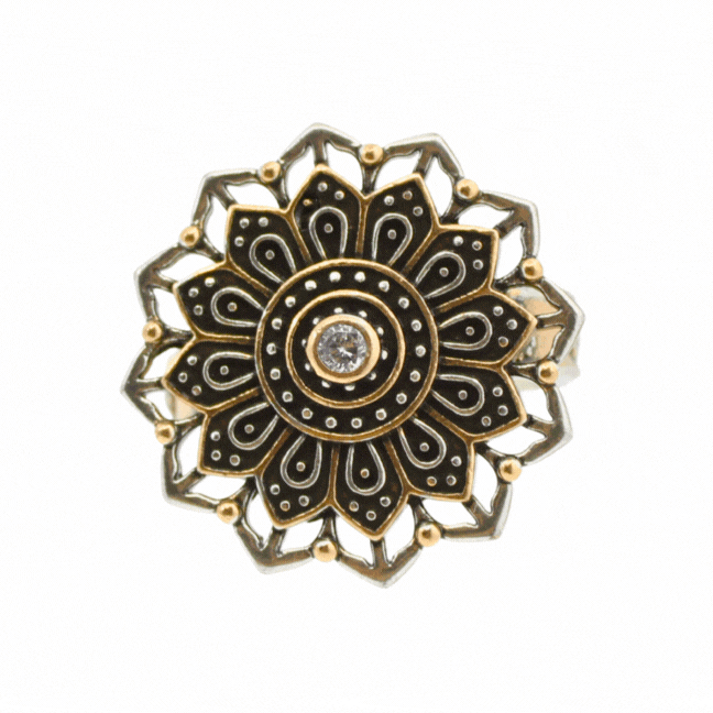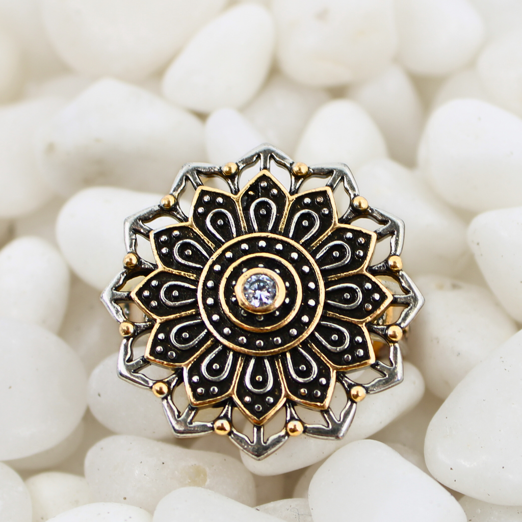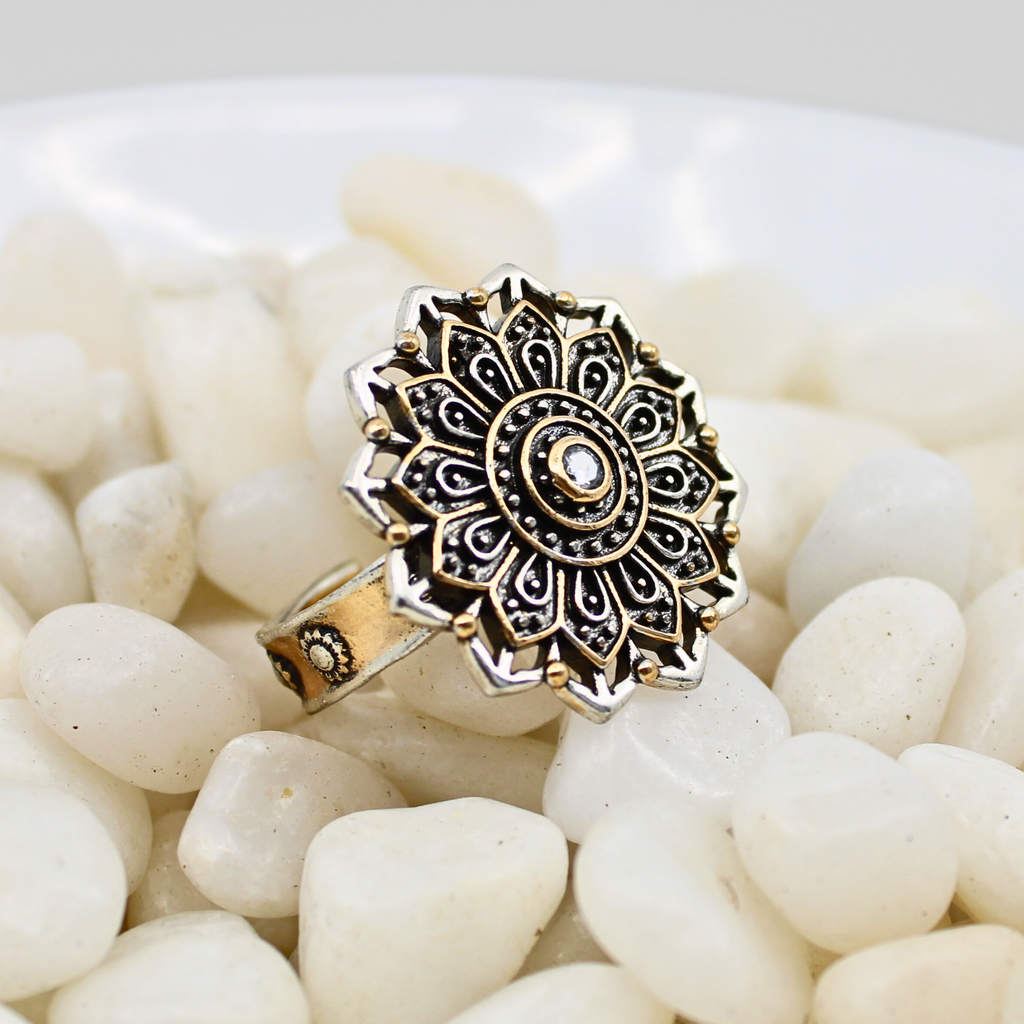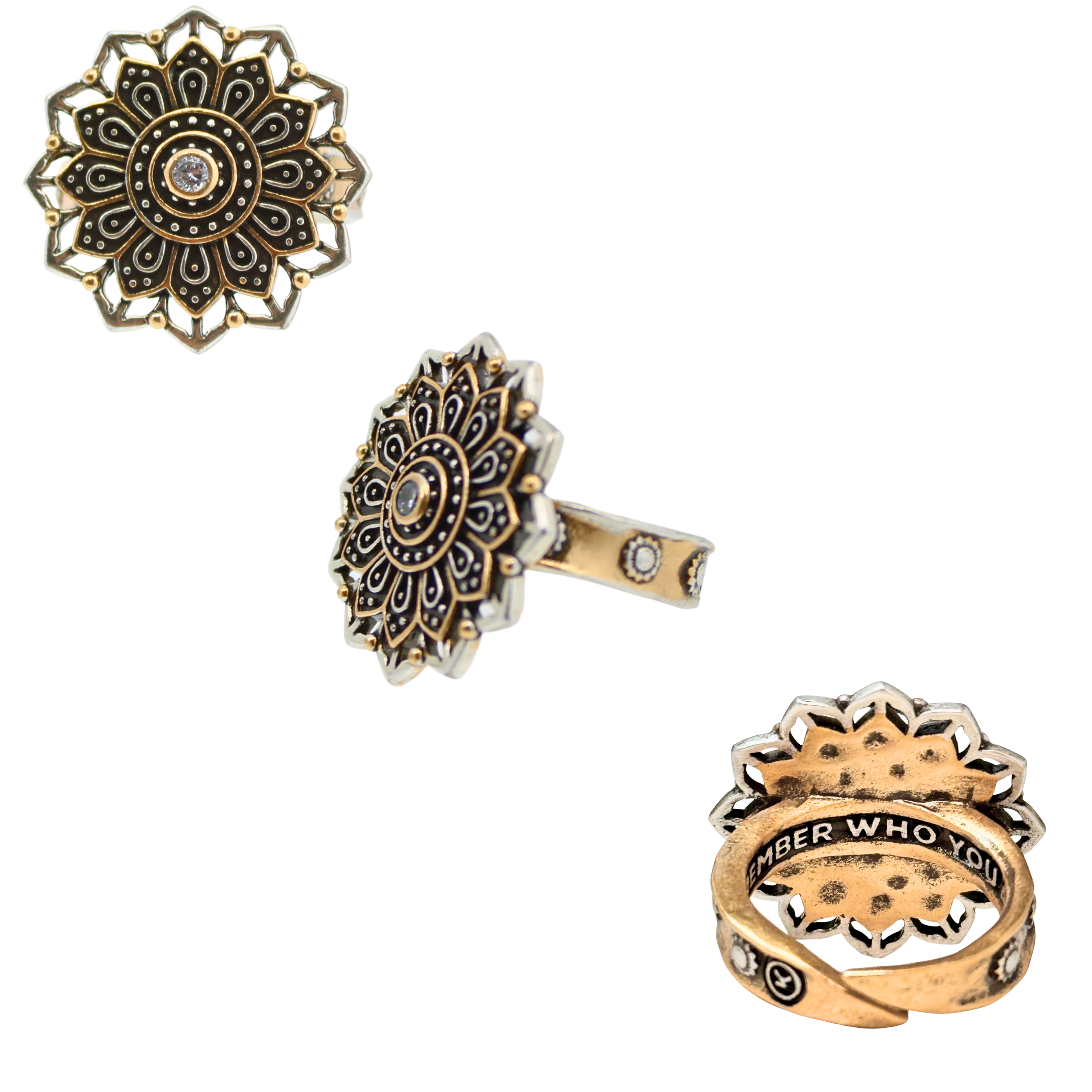 A statement piece with soul. This mixed-metal adjustable cocktail-style ring features a geometric flower mandala design, complete with a sparkling crystal inlay at the center. Inside the band, a hidden reminder:Â REMEMBER WHO YOU ARE. Wear it as a powerful symbol of your truth, strength, and inner light.Â