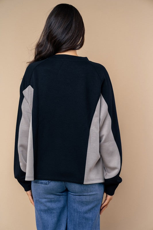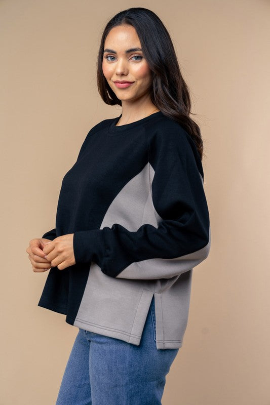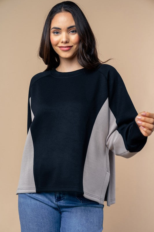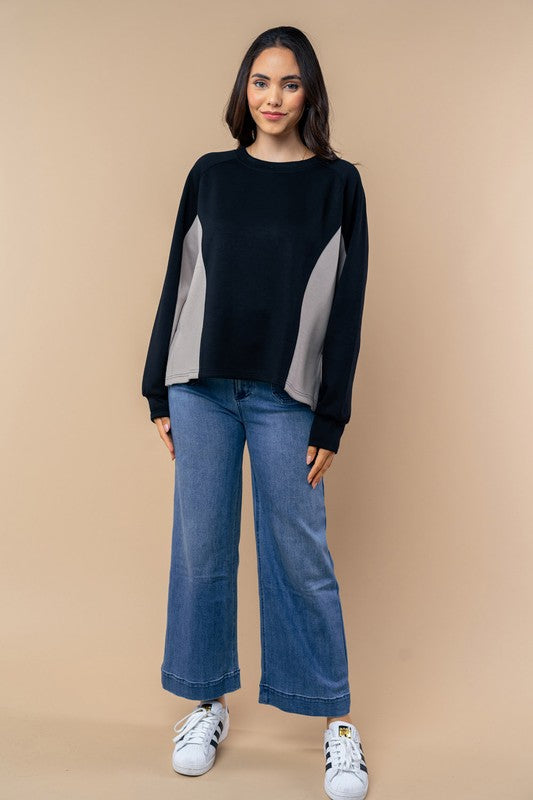 A long sleeve solid knit top with a round neck featuring a color blocked body and a true-to-size fit. Fabric is a lightweight knit.