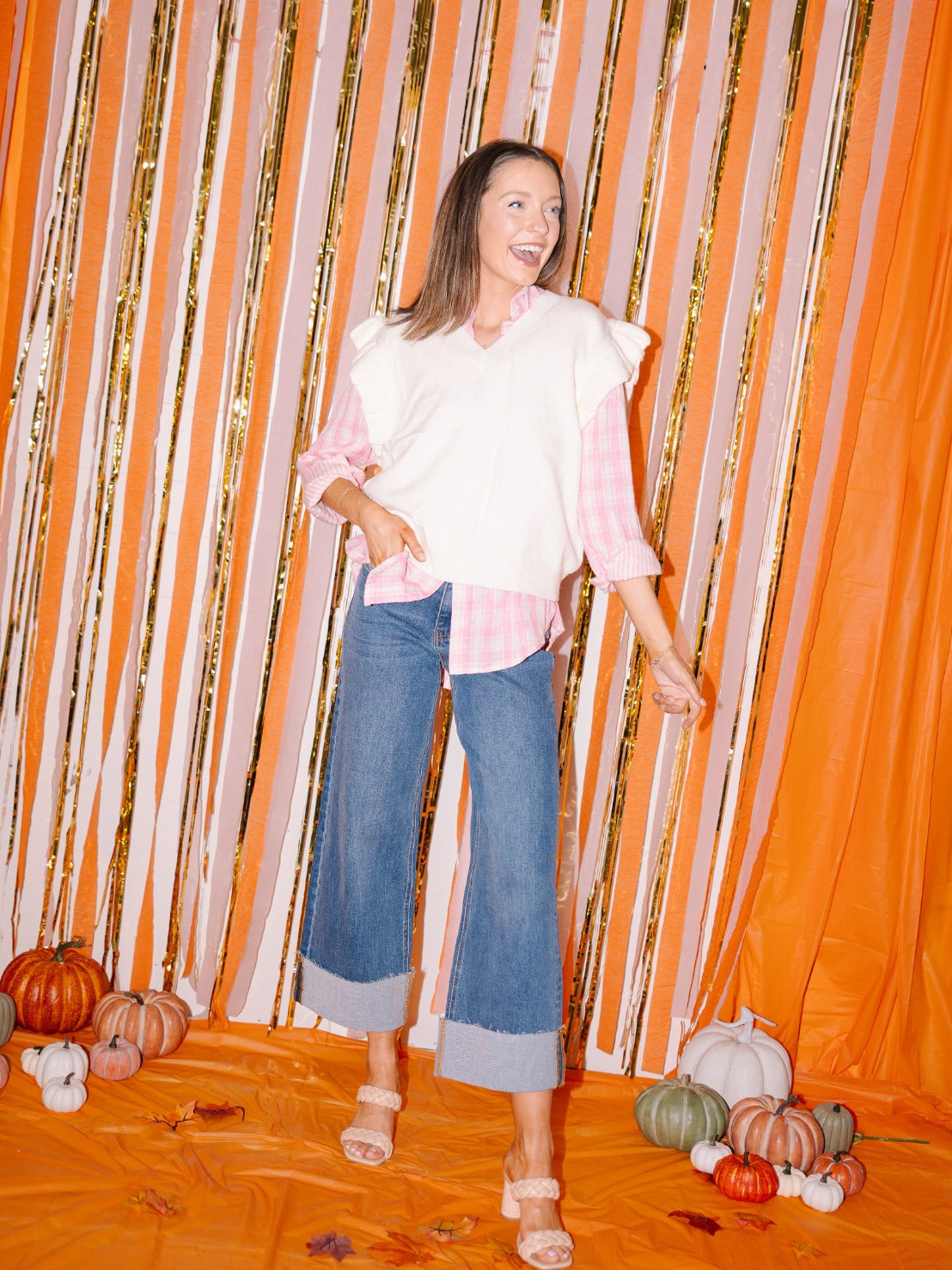 The Ruffle Sleeve Sweater Vest pairs perfectly with any color of The Kathryn Classic Button-Up, adding a touch of femininity with its ruffle sleeves. Ideal for layering, it offers a chic and stylish look.