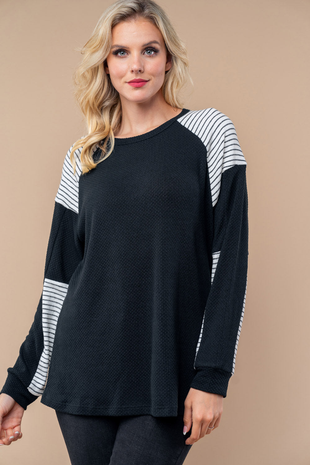 A long sleeve solid knit top with a round neck featuring a striped inset and a true-to-size fit.